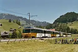 1904 begann der Bahnbetrieb auf der Strecke von Montbovon (Kanton Freiburg) nach Château-d’Oex (Kanton Waadt) und Gstaad im Kanton Bern, im folgenden Jahr auf der Strecke von Gstaad über den Saanenmöserpass, den höchsten Punkt im MOB-Streckennetz (1279 m ü. M.), nach Zweisimmen. Im Bahnhof Zweisimmen besteht der Anschluss an die 1902 eröffnete Erlenbach-Zweisimmen-Bahn (Normalspur). 1912 ergänzte die MOB die Verbindungen mit der Linie von Zweisimmen nach Lenk. Für den Transport normalspuriger Güterwagen von Zweisimmen nach Lenk setzt die MOB Rollböcke ein.