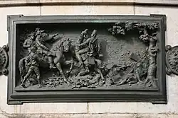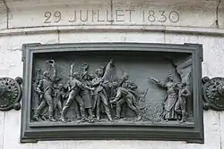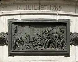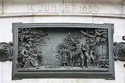 Der Steinsockel ist von zwölf bronzenen Hochreliefs umgeben, die durch Rosetten verbunden und auf Augenhöhe der Passanten angeordnet sind. Sie stellen eine Chronologie der Ereignisse dar, die die Geschichte der Französischen Republik zwischen 1789 und 1880 prägten: