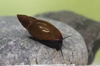 Das linksgewundene Gehäuse ist relativ schlank. Die Schale ist dünn und gelblich bis rötlichbraun. Die 6 Gewinde ist deutlich höher als die Öffnung und die Windungen sind kaum gewölbt, die Öffnung ist nicht aufgeblasen. Es misst bis 15 mm in der Höhe und 6 mm in der Breite. Der Mantel hatte keine Mantelfortsätze wie die Gattung Physa. Die Fühler sind dünn, Fuß und Mantel des Tieres sind schwarz.