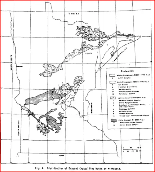 Die anstehenden Kristallingesteine Minnesotas. Der Morton-Gneis im Südwesten wird von Nummer 14 repräsentiert.
