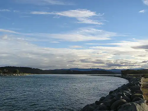 Moruya River. Blick flussaufwärts vom Wellenbrecher an der Nordseite der Mündung | ||