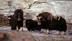 Der Moschusochse (Ovibos moschatus), auch als Bisamochse oder Schafsochse bezeichnet, ist ein Paarhufer aus der Unterfamilie der Antilopinae; innerhalb derer gehört er in die Verwandtschaftsgruppe der Ziegenartigen (Caprini). Die bis zu 1,50 m hohen männlichen und bis zu 1,30 m hohen weiblichen Tiere sind Bewohner der arktischen Tundren und heute ursprünglich nur noch in Grönland, Kanada und Alaska zu finden. Im Jahre 1974 wurde jedoch in Nordsibirien auf der Taimyr-Halbinsel eine Herde Moschusochsen aus Kanada und Alaska wieder erfolgreich angesiedelt. Kleinere Herden ursprünglich grönländischer Tiere leben inzwischen auch in Norwegen und Schweden. Der Gesamtbestand der Tiere nimmt ab und wurde Ende 2020 auf rund 127.000 Tiere geschätzt.[1]