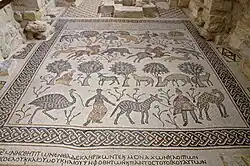 Ein 5 × 5,5 m großer Mosaikteppich befand sich als Blickfang in der Mitte des Baptisteriums. Inschriften nennen das Datum der Fertigstellung (August 531 n. Chr.), die amtierenden römischen Konsuln Lampadius und Orestes, die Auftraggeber (den Bischof Elias von Madaba und den Abt Elias) sowie die Mosaizisten Soelos, Kaioumas und Elias. Das Mosaik besteht aus vier Bildstreifen:[4]