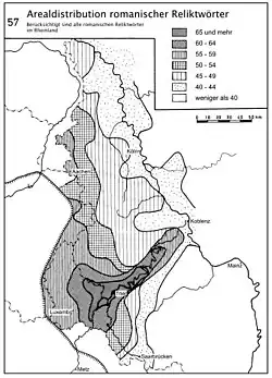 Neben den galloromanischen Orts- und Flurnamen zeigt auch der Wortschatz der moselländischen Dialekte eine Fülle von romanischen Einflüssen, welche als Reflexe der moselromanischen Sprachinsel zu betrachten sind. Eine quantifizierende kartographische Darstellung romanischer Reliktwortareale zeigt eine deutliche Massierung von Romanismen im Bereich mittlere Mosel bis in den Raum Trier und die Unterläufe von Saar und Sauer.[2] Beispiele solcher Wörter sind: Bäschoff 'Rückentraggefäß' < bascauda, Even 'Hafer' < avena, Fräge 'Erdbeere' < fraga, Gimme 'Knospe' < gemma, glinnen 'Trauben nachlesen' < glennare, More 'Brombeere' < morum, pauern 'Most filtern' < purare, Präter 'Flurschütz' < pratarius, Pülpes 'Hahnenfuß' (Pflanze) < pulli pes usw.[3]
