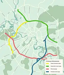 | Die vier Abschnitte des Moskauer Sekantenrings Nordwestliche Sekante (gelb) Nordöstliche Sekante (grün) Südöstliche Sekante (blau) Südliche Tagente (rot) | |
