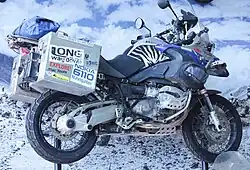 Insbesondere im Zweipersonenbetrieb erreicht das zulässige Gesamtgewicht des Fahrzeugs häufig einen kritischen Wert. Eine vollgetankte BMW R 1200 GS Adventure K255, die vom Hersteller explizit als Langstreckenmotorrad beworben wird, hat mit serienmäßigem Koffersystem eine zulässige Ladekapazität von 184 kg.[13] Gemäß dem Mikrozensus 2013 des Statistischen Bundesamts wiegt ein männlicher Deutscher im Alter von 40 bis 45 Jahren 86,4 kg, eine Frau gleichen Alters 68,1 kg.[14] Eine vollständige Schutzausrüstung (Helm, Kombi, Stiefel, Handschuhe, Protektoren) hat pro Person ein Gewicht von ungefähr 9 kg,[9] womit sich ein Gesamtgewicht von 172,5 kg für ein bekleidetes Motorradpaar mittleren Alters ergibt. Von den rechnerisch verbleibenden 11,5 kg Zuladung sind noch das Gewicht von Anbauteilen und Zubehör (Navigationsgerät, (Griff-/Sitz-)heizung, größeres Windschild, Diebstahlwarnanlage, Wechselsprechanlage, Tankrucksack, Motorschutz, zusätzliches Werkzeug) abzuziehen, wodurch nur wenig Restzuladung für Wechselkleidung, Waschzeug, Zelt, Schlafsack und Nahrung verbleibt.[9] Bei einem überladenen Fahrzeug können die Reifen, deren Lastindex auf das homologierte Gesamtgewicht ausgelegt ist, die Bremsen und die Federelemente das Fahrverhalten negativ beeinflussen und insbesondere bei Passabfahrten zum Lenkerschlagen und zu überhitzten Bremsen führen.[15]