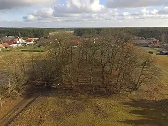 ![]() Der bewaldete Burgstall der Motte von Westen | ||