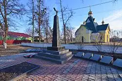Denkmal an den Großen Vaterländischen Krieg und Dorfkirche in Motyzhyn