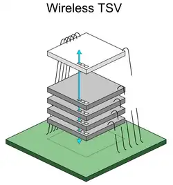 Bei SIP werden die elektrischen Verbindungen zwischen den einzelnen Dies ausgeführt wahlweise durch Bonddrähte, als leitfähige Dünnschichten an den Seitenkanten der Dies oder als Durchkontaktierung des Dies (englisch through-silicon via, TSV für Through-Silicon-Vias).[2] Letzteres ist eine neue Methode, gestapelte Dies untereinander zu verbinden. Dabei werden die Die-Lagen wie bei Multilayer-Leiterplatten durch Löcher kontaktiert.
