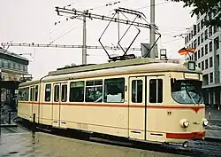 Diese auch als Stützgelenkwagen bezeichneten[1] Fahrzeuge bestehen aus einem selbstständig tragenden Wagenteil, auf dem sich Endwagen abstützen. WUMAG konstruierte 1928 einen Prototyp mit einem zweiachsigen Mittelwagen, auf den sich zwei einachsige Endwagen abstützten. In den 1950er und 1960er Jahren entstanden zweiteilige Fahrzeuge, teils als Umbauten älterer Wagen, die durch einen Endwagen – den Nachläufer mit einem zweiachsigen Drehgestell – verlängert wurden, so für Duisburg, Aachen und Freiburg (Typ Sputnik), teils als Neubauten, so für Köln, Krefeld, Remscheid und Bremen (mit einachsigem Nachläufer) und Augsburg (Typ GT5 mit dreiachsigem Vorderwagen und zweiachsigem Nachläufer). Die österreichische Variante stellt der 1963 gebaute Wiener Typ F dar, diese Wagen waren bis 1996 im Einsatz.