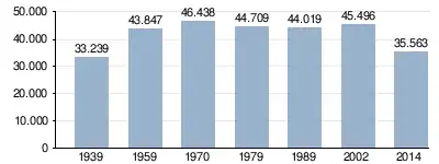 Die Einwohnerzahl beträgt 31.400 (Stand: 2021). Bis 2014 war die Einwohnerzahl mit 35.563[2] gegenüber der vorangegangenen Volkszählung (45.496 Einwohner 2002) um mehr als ein Fünftel gesunken,[3] leicht über dem Landesdurchschnitt. Zuvor war die Bevölkerung bereits seit einem starken Anstieg bis in die 1950er-Jahre annähernd stabil.