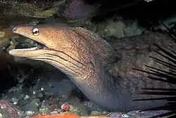 Muränen (Muraenidae) sind eine Familie aalartiger Knochenfische, die mit etwa 200 bisher bekannten Arten in flachen tropischen und subtropischen Meeren verbreitet sind. An den Küsten des südlichen Europa leben zwei Arten: die Mittelmeer-Muräne (Muraena helena) und die Braune Muräne (Gymnothorax unicolor).[1] Besonders häufig sind Muränen in den tropischen Korallenriffen: Bei den Marianen und bei den Marshallinseln werden 54 Arten gezählt, in den Gewässern um Hawaii sind sie mit 32 Arten nach den Lippfischen (Labridae) die artenreichste Fischfamilie.[2]