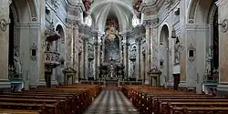 Das Kirchenschiff misst 25,5 × 15,3 m und ist 17,1 m hoch. Es wird von sechs Seitenaltären in nicht sehr tiefen Nischen flankiert. Zwischen ihnen gliedern hohe Pfeiler die Wände, die durch Kapitelle abgeschlossen werden, darüber verläuft ein auskragendes Gesims. Über diesem erhebt sich die Presbyteriumskuppel und das imposante Tonnengewölbe. Zwischen den jeweils zwei Pfeilern, die die Seitenkapellen voneinander trennen, sind Nischen und über diesen vier Oratorien eingebaut. Unter diesen befinden sich die kastenförmigen Beichtstühle. In dreien der Nischen stehen die Statuen der lateinischen Kirchenväter Ambrosius, Hieronymus und Gregor der Große von Caspar Schonger, in der vierten Nische befindet sich an der Nordwand die Kanzel, die 1780 von Andrea Filippini gestaltet wurde.