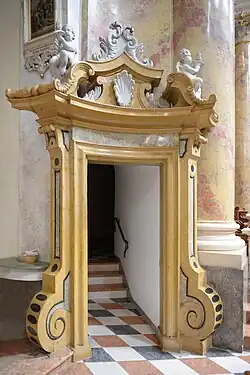Die Deckenfresken der Kirche wurden 1771–1773 von Martin Knoller geschaffen und beziehen sich alle auf den hl. Augustinus, den Kirchenpatron. Über der Orgelempore ist die Bekehrung des hl. Augustinus zu sehen (1771).