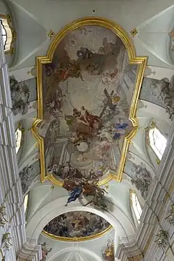 Im Tonnengewölbe des Kirchenschiffs ist in vergoldetem Stuckrahmen Augustinus als Lehrer und Schriftsteller (1772) dargestellt. Die illusionistische Tiefenwirkung dieses Bildes, das in der Mitte durch die gemalte Scheinarchitektur weit nach oben weist, wird durch die nach unten, aus dem Rahmen hinaus stürzenden Häretiker, die von Blitzen aus der Feder des Heiligen getroffen werden, noch gesteigert. Die Mitte des Freskos nimmt Christus in der Herrlichkeit des Himmels ein, auf halber Höhe ist die Personifikation der Kirche mit konsekrierter Hostie in der Hand zu sehen. Die Maße des Deckenfreskos sind 23 × 9 m. Außerhalb des Stuckrahmens, aber direkt an das Mittelfresko anschließend, sind die Personifikationen der vier Kontinente Europa, Afrika, Amerika und Asien dargestellt.