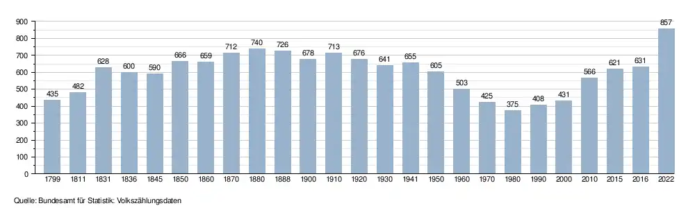 - ↑ a b Daten der Eidgenössischen Volkszählungen ab 1850 nach Gemeinden. (XLSX; 10 MB) Bundesamt für Statistik, Neuchâtel, 12. Juli 2024, abgerufen am 12. September 2025 (Öffnung in Excel nur über "Anhang/Excel-Datensatz" möglich).