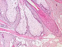 Histologisches Bild einer Haarwurzel mit Talgdrüsen und Haaraufrichtemuskel