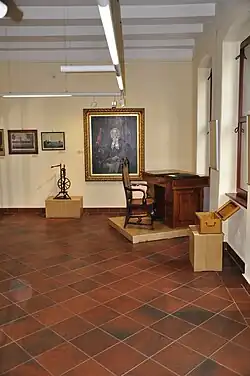 - ↑ Hinter dem Schreibtisch von Johann Gottlob Nathusius hängt ein Ölgemälde zu seiner Frau Luise, daneben steht ihr Spinnrad