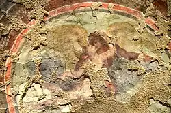 - Ein eigener Raum ist einem großen fragmentierten Deckenfresko aus dem 2./3. Jahrhundert gewidmet, in dessen Mitte Amor und Psyche dargestellt sind. Von 1972 bis 1973 wurden die Fragmente aus der ehemaligen römischen Zivilsiedlung (Plochbergergründe) geborgen und 1979 wieder an einer Decke angebracht.[5][6]