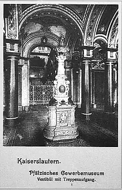 Um auch im linksrheinischen, weit vom Landeszentrum entfernten Teil des Königreichs Bayern die Ausbildung hochwertiger Fachkräfte für das Bau- und Kunsthandwerk zu gewährleisten, gründete die Regierung dort 1874 eine Baugewerkschule mit Sitz in Kaiserslautern, das zentral im pfälzischen Gebiet lag. Das Institut entstand in Anlehnung an die bereits 1823 gegründete Baugewerkschule München. Gleichzeitig wurde das Pfälzische Gewerbemuseum zur Ausstellung von historischen und neuen Produkten des pfälzischen Kunsthandwerks gegründet. Regierungspräsident Paul von Braun förderte beide Projekte nachhaltig; erster Direktor beider Institutionen wurde der Architekt Carl Spatz (1845–1907), der auch das Gebäude entwarf, in dem beide gemeinsam angesiedelt werden sollten. Es wurde zwischen 1875 und 1880 im Stil der Neorenaissance erbaut. Die Baugewerkschule nahm das Erdgeschoss ein, das Museum nutzte das Obergeschoss.[1] Im Inneren gab es repräsentative Räume mit prachtvoller Ausstattung. Besonders die Eingangshalle mit ihren Porphyrsäulen war berühmt, ebenso wie der große Festsaal im Obergeschoss, genannt Königssaal. Die Innenräume waren weitgehend mit Fresken und Dekorationsmalereien geschmückt. Janez Šubic (1850–1889), einer der namhaftesten Maler Sloweniens und von 1884 bis 1889 Lehrer für dekorative Kunst an der Kreisbaugewerkschule Kaiserslautern, gehörte zu den Ausführenden,[2] genau wie Jakob Rumetsch aus Speyer, ebenfalls Lehrer an der Kreisbaugewerkschule, der in Kaiserslautern auch die Villa Munzinger ausmalte.[3]