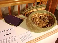 Dankeschön-Vitrine mit einem historischen Fußwärmer aus dem Schwarzwald.