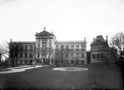 Das Kaffeehaus war von Anfang an zu klein für die Sammlungen des Museums und nicht repräsentativ genug, so dass nach langer Überlegung über den Bau eines neuen Gebäudes entschieden wurde. Die ursprünglichen Entwürfe wurden von den Architekten Antonín Wiehl und Jan Koula eingereicht und schließlich wurde das Projekt von Antonín Balšánek entworfen.[3] Das Gebäude im Stil der Neurenaissance wurde zwischen den Jahren 1896 und 1898 erbaut und am 27. September 1900 feierlich eröffnet. Es handelt sich um ein zweistöckiges Gebäude, das aus zwei symmetrischen Seitenflügeln mit einem Risalit in der Mitte besteht, der mit einem Tympanon gekrönt ist. Darin ist das Relief Geschichte mit Kunst, Wissenschaft und Handwerken bilden den Ruhm unserer Vergangenheit von Ladislav Šaloun zu sehen, auf dessen Spitze sich die Skulptur Allegorie von Prag desselben Autors befindet. Die hintere Fassade ist durch einen halbrunden Risalit gegliedert. Die Fassaden sind ferner von F. Stránský, V. Štaff und F. Hergesell geschmückt.