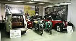 Aufbruch (1948–1955) verdeutlicht, dass nach dem Krieg zunächst kaum Neuentwicklung stattfand. Stattdessen wurde auf Fahrzeugmodelle von vor dem Kriegsende zurückgegriffen. Deren Weiterentwicklung beschränkte sich meist auf eine Anpassung der Konstruktion an die vorhandene Rohstoffknappheit. So ist beispielsweise der ausgestellte IFA F 8 in großen Teilen identisch mit dem DKW F 8, welcher von 1939 bis 1942 gebaut wurde. Aufgrund des Mangels an Karosserieblech wurden die Motorhaube und andere Karosserieteile aus Duroplast hergestellt, einem Kunststoff der aus Abfallprodukten der chemischen Industrie sowie für die Textilindustrie unbrauchbarer Baumwolle hergestellt werden konnte. Gezeigt wird auch ein Hilfsmotor für Fahrräder, der an jedem Rad nachgerüstet werden konnte. |