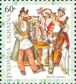 Zu den gängigen traditionellen Instrumenten gehören: Kobsa (Laute), Bandura, Torban (Basslaute), Violine, Basolya (3-saitiges Cello), Lira (Drehleier) und Zymbal; die Sopilka (Kernspaltflöte), die Flojara (Längsflöte), die Trembita (Alphorn), die Sackpfeife; die Rahmentrommel, die Pauke, das Tamburin und die Maultrommel. Traditionelle Instrumentalensembles werden oft als troïstï musyki bezeichnet (wörtlich „drei Musiker“, die das Ensemble typischerweise bilden, z. B. Geige, Sopilka und Rahmentrommel).