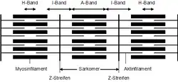 Eine Muskelfibrille besteht aus Hunderten hintereinandergeschalteten Baueinheiten mit gleichem inneren Aufbau, den Sarkomeren. Betrachtet man eine Muskelfibrille mit dem Lichtmikroskop, so wird eine typische Querstreifung sichtbar, die durch die regelmäßige Verteilung der Muskelfilamente verursacht wird. Es entsteht ein typisches Bandenmuster.