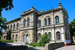 Das breitgelagerte Gebäude wurde im Stil der Neorenaissance mit leichten Jugendstil-Anleihen errichtet.[4] Vor dem Haupteingang an der Südostseite befindet sich eine Freitreppe aus Marmor[13] und führt zur mittleren der sieben Fensterachsen des dort zu findenden Risalits. Diese Mittelachse wird durch einen Dreiecksgiebel bekrönt, zudem befindet sich über den mittleren drei Achsen des Risalits ein kleines herausgehobenes Dach. Die Fassade wird durch Gesimse und Pilaster sowie einen Fries gegliedert. Die Fassade ist durchgehend durch Rustizierung geprägt.