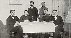 Ukrainische Delegation in Brest-Litowsk. Von links: Mykola Ljubynskyj, Wsewolod Holubowytsch, Mykola Liwyzkyj, Lussenti, Mychailo Polos und Oleksandr Sewrjuk