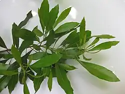 Die wechselständig an den Zweigen angeordneten Laubblätter sind in Blattstiel und -spreite gegliedert. Der Blattstiel ist bis 1 Zentimeter lang. Die lederige, einfache Blattspreite ist bei einer Länge von 2 bis 10,5 (bis 13,3) Zentimetern sowie einer Breite bis 3,3 Zentimetern verkehrt-eiförmig bis -eilanzettlich mit keilförmiger teils herblaufender Basis und spitzem bis gerundetem oberem Ende. Der Blattrand ist ganz oder oberhalb der Mitte grob gesägt oder gezähnt. Die Blattunterseite ist hell- gelbgrün und kahl; nur die Mittelrippe ist fein behaart. Die Blattoberseite ist dunkel-grün und kahl bis fein behaart. Auf beiden Seiten der Laubblätter befinden sich dicht gelbe bis orangefarbene Drüsen. Die Blätter sind aromatisch.[1]