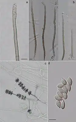 Myrmecridium schulzeri: a, b: Konidienträger und Konidien. c: Sporulation im Nährmedium. d: Konidien. Messleisten: 5 μm. | ||||||||||||