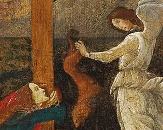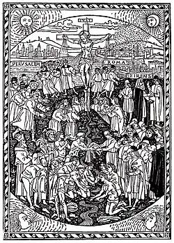 Botticellis Gemälde liegt allem Anschein nach ein Holzschnitt von Bartolomeo di Giovanni (1458–1501) zugrunde, der 1496 zur Illustration eines Traktats von Domenico Benivieni (1460–1507) diente.[1] Das Traktat wurde von Benivieni zur Verteidigung Savonarolas Lehren und Prophezeiungen verfasst und entstand zur Publikation einer Predigt, die Savonarola vermutlich 1494 gehalten hatte. In dieser Predigt prophezeite Savonarola, dass eine radikale Erneuerung der Kirche und der Gesellschaft unmittelbar bevorstehe. Zuvor würde allerdings ganz Italien von Not und Elend heimgesucht. Dazu beschrieb Savonarola seine Vision von zwei Kreuzen. Ein schwarzes Kreuz sah er in Rom, woraufhin sich der Himmel über Rom verdunkelte und von Blitzen, Feuer, Schwertern und Pfeilen überzogen war. Anschließend klarte der Himmel auf und Savonarola erkannte ein goldenes Kreuz in Jerusalem, das die Welt erblühen ließ und von allen Völkern angebetet und umarmt wurde.