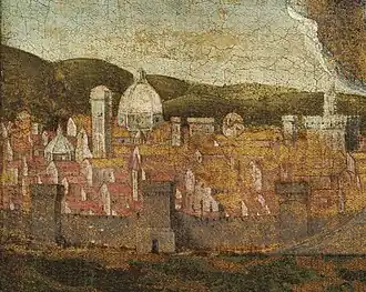 Bartolomeo di Giovanni verzichtete in seiner Darstellung auf das Kreuz in Rom und positionierte das Kreuz von Jerusalem mit den herbeigeeilten Völkern in die Bildmitte. Über der Stadt Jerusalem links ist der Himmel schon aufgeklart, während rechts über Rom Unwetter hereinbrechen. Unterhalb von Rom sieht man Florenz, das schon nicht mehr von Unwetter bedroht ist und somit wie Jerusalem als erleuchtet und erlöst gelten kann. Florenz galt in dieser Wendezeit als auserwählte Stadt, der eine führende Rolle bei der spirituellen Erneuerung zukommen sollte. Botticelli entwickelte dieses Bildmotiv weiter, indem er Florenz links oben an die Stelle Jerusalems setzte und sein Bild um die Figur eines segnenden Gottvaters ergänzte, der wohlgefällig über der gereinigten Stadt wacht. Die finsteren Mächte, die zuvor über Florenz geherrscht hatten, konnten besiegt und vertrieben werden. Anstelle der Völkerscharen umarmt jetzt die büßende Maria Magdalena den Stamm des Kreuzes. Mit Christus am Kreuz vor den Stadtmauern könnte Florenz auch als ein neues Jerusalem verstanden werden.