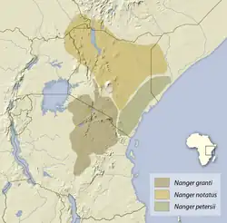 - ↑ Hans R. Siegismund, Eline D. Lorenzen und Peter Arctander: Nanger (granti) Grant's Gazelle Species Group. In: Jonathan Kingdon, David Happold, Michael Hoffmann, Thomas Butynski, Meredith Happold und Jan Kalina (Hrsg.): Mammals of Africa Volume VI. Pigs, Hippopotamuses, Chevrotain, Giraffes, Deer and Bovids. Bloomsbury, London, 2013, S. 373–379