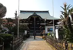 Man betritt den Tempel von Osten her und gelangt geradewegs zur Haupthalle (本堂 Hondō; im Plan 1), die hier poetisch „Tsuji no Waeiden“ (月輪影殿), etwa „Mondlicht-Halle“, genannt wird. Man passiert auf dem Wege dorthin zwei Gedenksteine auf der rechten Seite, zunächst den für Hamada Hikozō (9), besser bekannt als „Joseph Heco“, da er sich lange in den USA aufgehalten hatte. Es ist der erste Gedenkstein in Japan, der eine Inschrift auf Englisch trägt. Der Gedenkstein dahinter ist Kitakaze Shōzō (北風 正造; 8), einem Unternehmer gewidmet, der sich zu Beginn der Meiji-Zeit für die Entwicklung der Präfektur und für Kōbe eingesetzt hatte. Hinter den Gedenksteinen befindet sich im Norden das Abt- und Mönchsquartier (A).