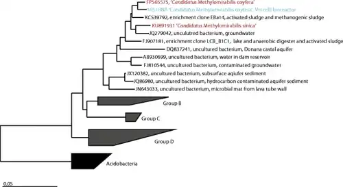 Kladogramm, das die Beziehungen zwischen dem 16S-rRNA-Contig verschiedener Methylomirabilis-Spezies und naher verwandter Sequenzen darstellt. Dargestellt ist das Clustering von NC10 in die Kladen A-D (Gruppe A mit Methylomirabilis im Detail). Der Baum wurde auf Acidobacteria als Outgroup gerootet.