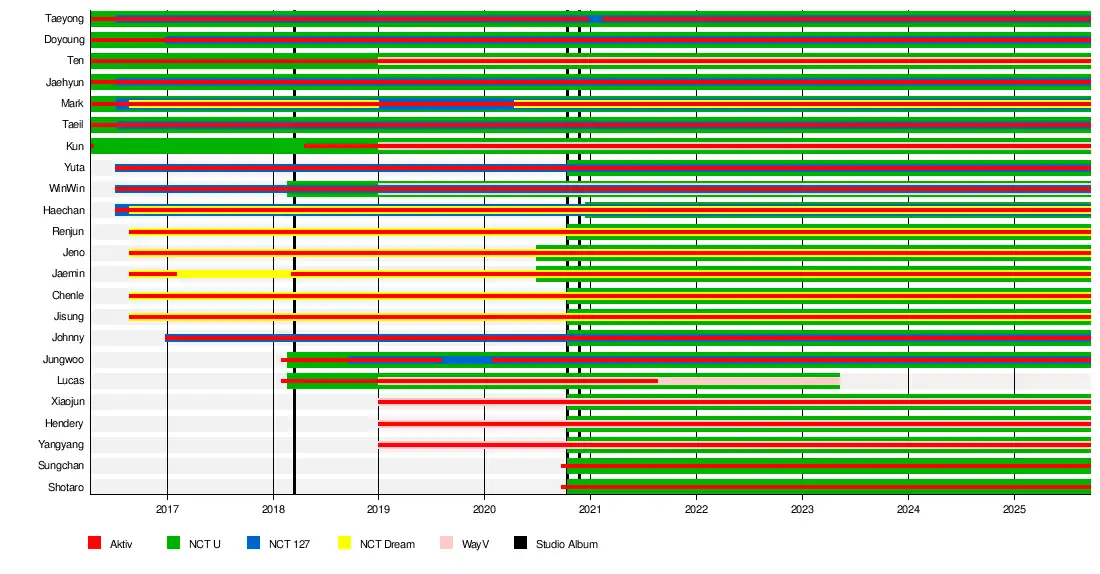 Bis auf Hansol, der später unter J-Flo Entertainment der K-Pop Gruppe NewKidd (koreanisch 뉴키드) beitrat, debütierten alle 14 weiteren männlichen Trainees des Teams im Zeitraum von 2016 bis Anfang 2018 in NCT.[13]
