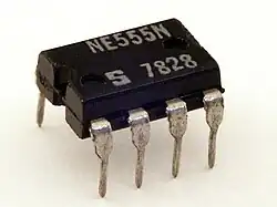 Die integrierte Schaltung NE555 ist ein aktives elektronisches Bauelement, das einen Ausgang unter bestimmten Bedingungen ein- oder ausschaltet. Es eignet sich sehr gut für Zeitsteuerungen und Taktgeber und wird teils sogar in Schaltnetzteilen verwendet. Vorgestellt wurde der NE555 – häufig abkürzend auch nur als 555 bezeichnet – erstmals 1972 vom US-amerikanischen Halbleiterhersteller Signetics. Aufgrund seiner Robustheit und Zuverlässigkeit wird er auch heute noch eingesetzt, wobei seine Einsatzgebiete vom Spielzeug bis hin zur Raumfahrt reichen. Der NE555 ist die weltweit meistverkaufte integrierte Schaltung.[1]