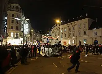 Am 8. Jänner 2015 kündigte das NOWKR-Bündnis Widerstand gegen die deutsche rechtspopulistische Pegida-Bewegung an. Das Bündnis kündigte an, Demonstrationen und Blockaden gegen die erste österreichische Pegida-Demonstration am 2. Februar 2015 zu organisieren.[30] So wurde für den 2. Februar für 17:30 zur Freyung mobilisiert[31], etwa 200 kamen.[32]