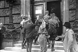 Am selben Tag übertrug Reichspräsident Friedrich Ebert auf Grundlage von Artikel 48 der Weimarer Reichsverfassung die vollziehende Gewalt an den Chef der Heeresleitung Hans von Seeckt. Dieser erließ am 23. November 1923 ein reichsweites Verbot gegen die NSDAP, das bis zum 27. Februar 1925 gelten sollte.[6] Das gesamte Parteivermögen wurde konfisziert, die Geschäftsstelle in München geschlossen, die Parteizeitung Völkischer Beobachter verboten. Ebenfalls verboten wurden die Deutschvölkische Freiheitspartei (DVFP), deren Vorsitzender Erich Ludendorff beim Putsch eine zentrale Rolle gespielt hatte, und die Kommunistische Partei Deutschlands, deren Hamburger Aufstand wenige Wochen zuvor gescheitert war.
