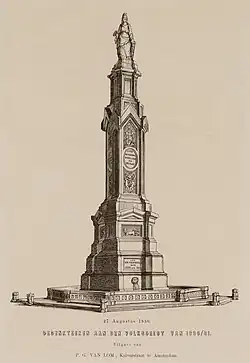 Zunächst war geplant, ein großes Kreuz aus den eingeschmolzenen Kanonen aufzustellen, die von den Belgiern erbeutet worden waren. Mit Rücksicht auf die Gefühle der Belgier wurde aber von dieser Idee Abstand genommen, und man entschied sich für eine allegorische Frauengestalt, die die Einheit des niederländischen Volkes symbolisieren sollte, bezugnehmend auf das Motiv der Nederlandse Maagd.[1]