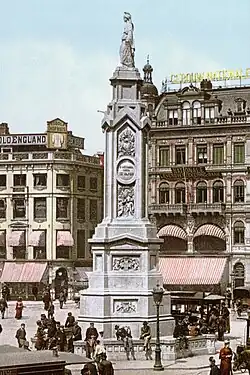 Die Figur wurde von dem flämischen Bildhauer Louis Royer erschaffen, der schon das Rembrandt-Denkmal auf dem Rembrandtplein erstellt hatte.[13] Sie war vier Meter hoch und stand auf einer Säule von 18 Metern Höhe, die von dem niederländischen Maler Paul Tétar van Elven entworfen worden war. Auf der Säule befanden sich mehrere Inschriften, darunter auf der Vorderseite Aan de volksgeest van 1830 en 1831 (An den Volksgeist von 1830 und 1831) und auf der Rückseite Tot opwekking van tijdgenoot en nageslacht (Zur Erweckung von Zeitgenossen und Nachkommen). Die Frauengestalt war in antike Kleidung gekleidet und hielt in ihrem rechten Arm ein Füllhorn, den linken stützte sie auf einen Köcher mit Pfeilen.[1][14] Ihren Blick richtete sie auf den königlichen Paleis op de Dam. Um das Monument errichten zu können, mussten die Fundamente eines Waagehauses entfernt werden, das in den Zeiten, als der Dam noch ein Marktplatz war, dort gestanden hatte und 1808 abgerissen worden war.[15]