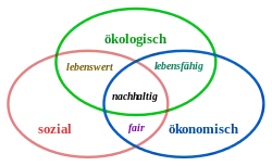 Die Idee der Nachhaltigkeit mit drei Dimensionen ist die in der Literatur vorherrschende Interpretation. Sie wird durch eine Resolution bestätigt, die die Vereinten Nationen auf dem Weltgipfel 2005 verabschiedet haben:[11]