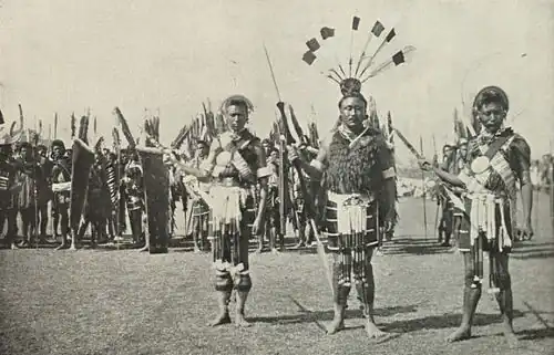Die genaue Herkunft der namensgebenden Naga-Stämme ist unbekannt. Eine Einwanderung aus Südwestchina, Südostasien oder den nördlichen mongolischen Regionen wird diskutiert. Die Naga waren bei der Entstehung des Ahom-Reiches in Assam 1228 schon im späteren Nagaland ansässig.[14] Die Nagas lebten in kriegerischen Stammesgesellschaften und praktizierten unter anderem die Kopfjagd. Nach dem Ende des Ahom-Reiches in Assam kam dieses 1826 unter die Kontrolle der Britischen Ostindien-Kompanie. Die Nagas gerieten durch ihre Praxis, Raubzüge in das Tiefland zu unternehmen, in Konflikt mit den Briten und diese antworteten mit verschiedenen Strafexpeditionen nach Nagaland, die jedoch zu keiner dauerhaften Befriedung führten. Im Jahr 1866 errichtete die britisch-indische Administration in Samaguting (ab 1878 in Kohima) einen Verwaltungsposten, um das Gebiet administrativ zu organisieren. 1879/80 kam es zu einem landesweiten Aufstand, der durch britische Truppen im Gefecht von Khonoma niedergeschlagen wurde. Danach gaben die Naga ihren bewaffneten Widerstand weitgehend auf. In der Folgezeit kamen christliche Missionare ins Land, die einen großen Teil der Bevölkerung von den bisherigen ethnischen Religionen zum Christentum bekehrten. Ein Teil des Landes wurde durch die Briten als Distrikt organisiert (Naga Hills district), der weiter zum Bergland hin gelegene Teil blieb weitgehend unorganisiert (Naga tribal area). Formal unterstanden die Gebiete dem Gouverneur der Provinz Assam.[15]