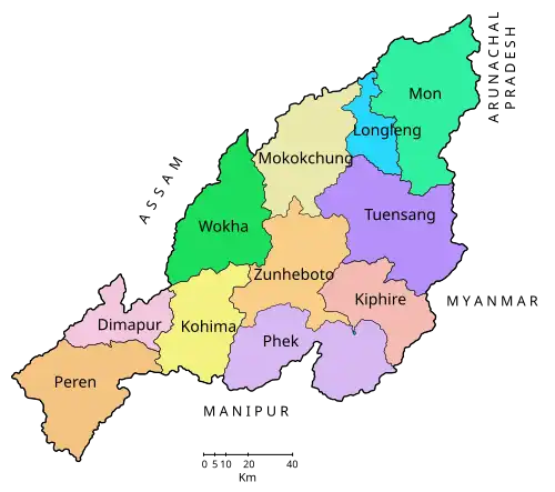 Der Bundesstaat Nagaland ist in folgende elf Distrikte untergliedert (Einwohnerzahl und Bevölkerungsdichte nach der Volkszählung 2011):[27]