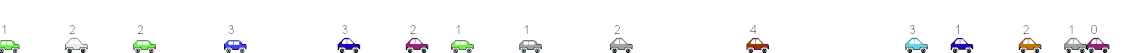 Animiertes Nagel-Schreckenberg-Modell mit 15 Autos auf einer Straße der Länge 50. Die Trödelwahrscheinlichkeit liegt bei 10 %. Obwohl keine Hindernisse vorliegen, bilden sich immer wieder kurze Phantomstaus.