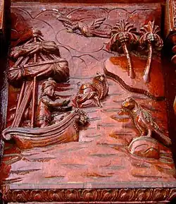 - Zusammenfassung von Manimekalai: Eine Tänzerin namens Manimekalai wird von dem König Udayakumar verfolgt um sie zu heiraten, jedoch möchte sie ein spirituelles Leben führen. Die Seegöttin Manimekalai ließ Manimekalai einschlafen und brachte sie auf die Insel Manipallavam (heutiges Nainativu). Nachdem sie aufwachte lief sie um die Insel und fand den Altar Buddhas (den Lord Indra dort gesetzt hatte, auf dem Buddha lehrte). Menschen die den Altar verehren, würden sich magischerweise an ihre vorherigen Reinkarnationen erinnern. Manimekalai verehrte ihn und wusste von ihren ehemaligen Leben. Deeva-Teelakai erzählt mehr von dem Altar und macht Manimekalai auf ein magisches Objekt aufmerksam namens Amuthasurabhi (Kuh des Überflusses), welches für alle Ewigkeit Hunger stillen soll.[4]