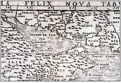 Durch die osmanische Eroberung Bagdads von 1534 erhielten die Türken mit dem Hafen Basras an der Golfspitze einen Zugang zum Indischen Ozean. Dies fiel zeitlich mit den frühen kartographischen Bemühungen des Gerhard Mercator zusammen, welcher 1541 versuchte, aktuelle Globen und Karten herzustellen, auf denen er den Golf als Sinus Persicus, nunc Mare de Balsera („Persischer Golf, jetzt Meer von Basra“) bezeichnete.[13] Auf seiner Weltkarte von 1569 bezeichnete er den Golf jedoch als Mare di Mesendin (nach der Halbinsel Musandam im heutigen Oman),[14] während sein Kontrahent Abraham Ortelius für seinen Weltatlas von 1570 die Bezeichnung Mare El Catif, olim Sinus Persicus (nach dem arabischen Hafen Qatif) verwendete. Für den Golfzugang, der Straße von Hormus, wählte er jedoch die Bezeichnung Basora Fretum (Straße von Basra).[15] Trotz dieser Differenzen verbreitete sich der Begriff Persischer Golf immer mehr, die Türkei verwendet jedoch bis heute den Begriff „Golf von Basra“ (Basra Körfezi).[16]